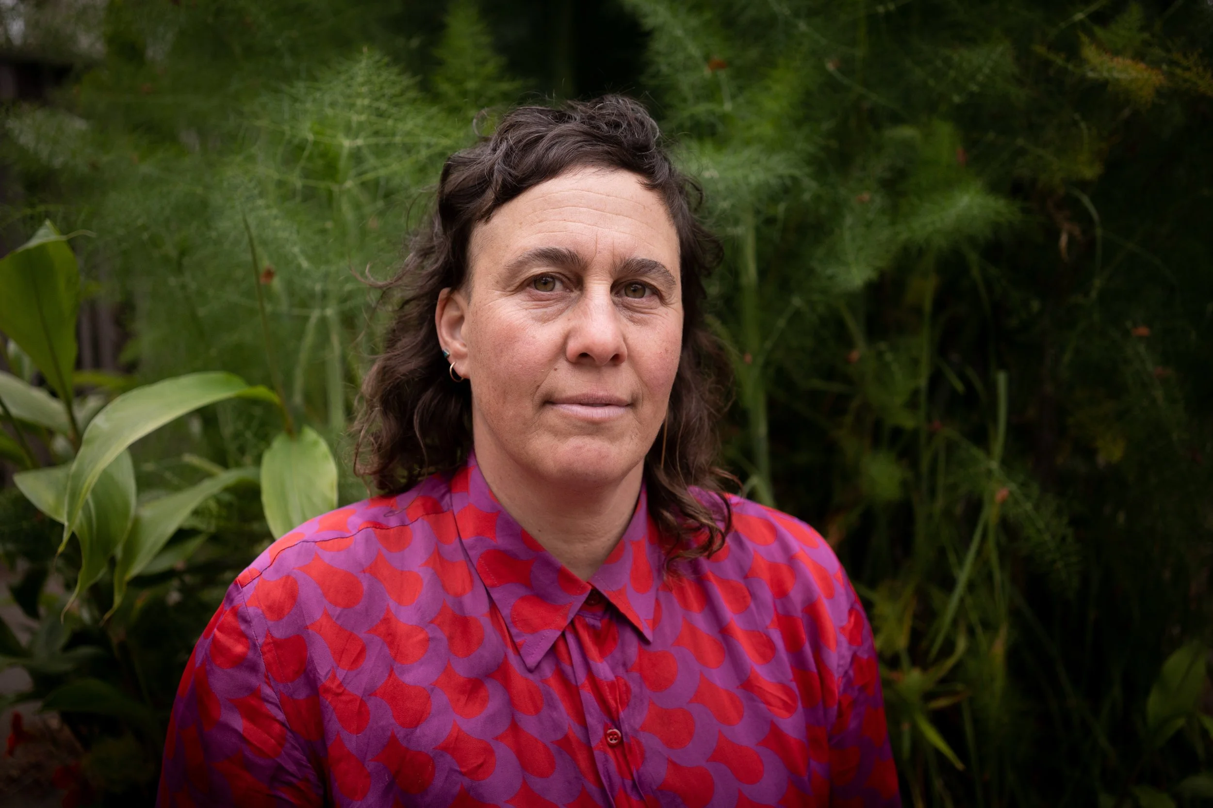 Smiling softly, Margit wears a red shirt against a lush vegetation background.